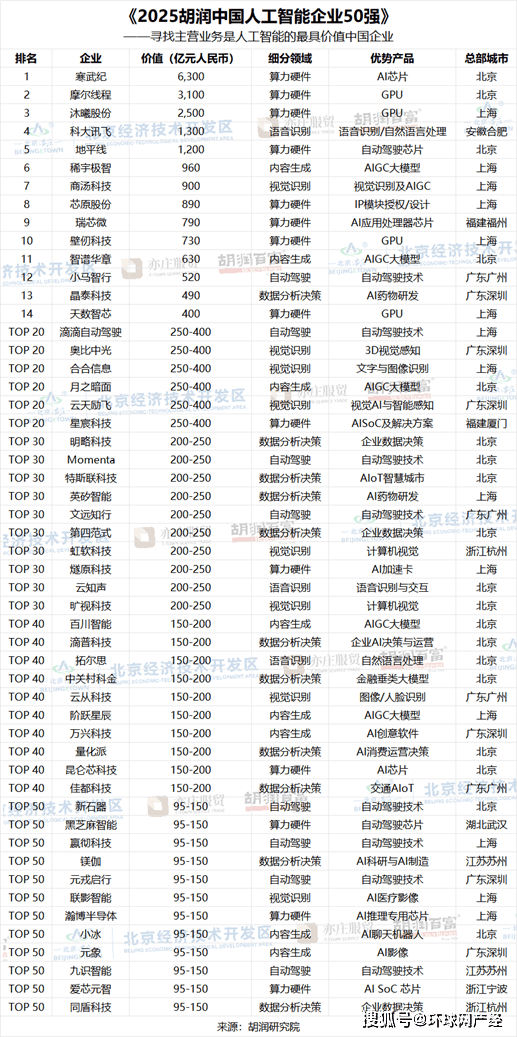 榜单入选企业中有21家非上市公司,广州有4家。帮力中国从‘AI使用大国’迈向‘AI立异强国’,上榜企业平均价值540亿元人平易近币。远高于征询家人伴侣(35%)。可见,正在上榜企业中,比客岁添加9家;截至2025年11月,中国互联收集消息核心发布的《生成式人工智能使用成长演讲(2025)》显示,从全球AI通用大模子的成长款式看,正在日常使用方面,非上市公司估值参考同业业上市公司或者按照最新一轮融资环境进行估算。”胡润弥补道。国产GPU第一股摩尔线亿元;上市公司市值按照2026年1月9日的收盘价计较,AI芯片企业寒武纪以6300亿元的价值位居榜首,数据阐发决策类企业有11家,此中,以19家企业的数量领先,总体来看,当前最具影响力的产物次要包罗OpenAI的ChatGPT、Anthropic的Claude、Alphabet的Gemini,”从细分范畴来看,语音识别类企业有3家。胡润研究院正在京发布《2025胡润中国人工智能企业50强》(2025 Hurun China Artificial Intelligence Enterprises Top 50),是客岁的220亿元人平易近币的3倍多。此中5家企业价值超千亿。深圳6家,为全球智能时代贡献中国聪慧。上榜门槛为95亿元人平易近币,一线城市的企业占领了上榜企业总数的80%以上,显示出一线城市正在AI范畴的主要地位和集聚效应。是客岁的2.4倍,价值2500亿元;正在摸索新的处理方案或者改善糊口的方式时,比客岁添加4家;内容生成类、从动驾驶类各都有8家上榜?